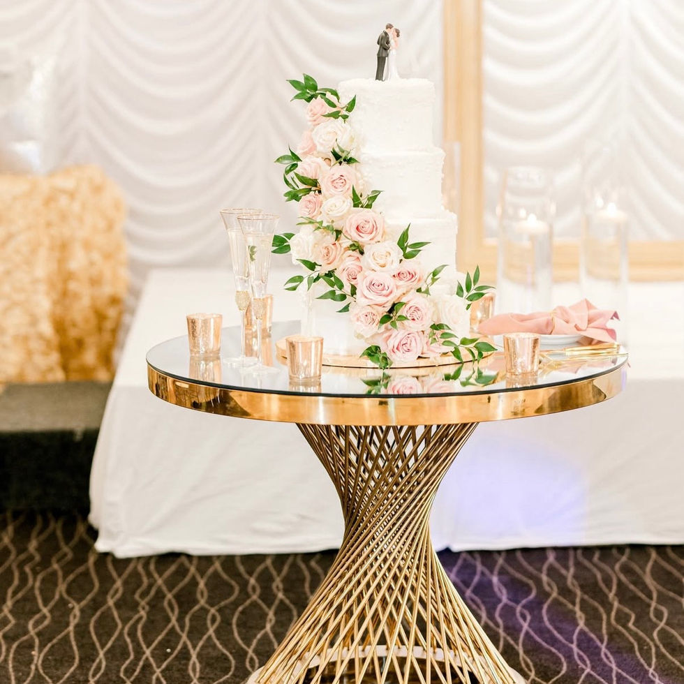 Gorgeous gold spiral cake table suitable for wedding and special events.